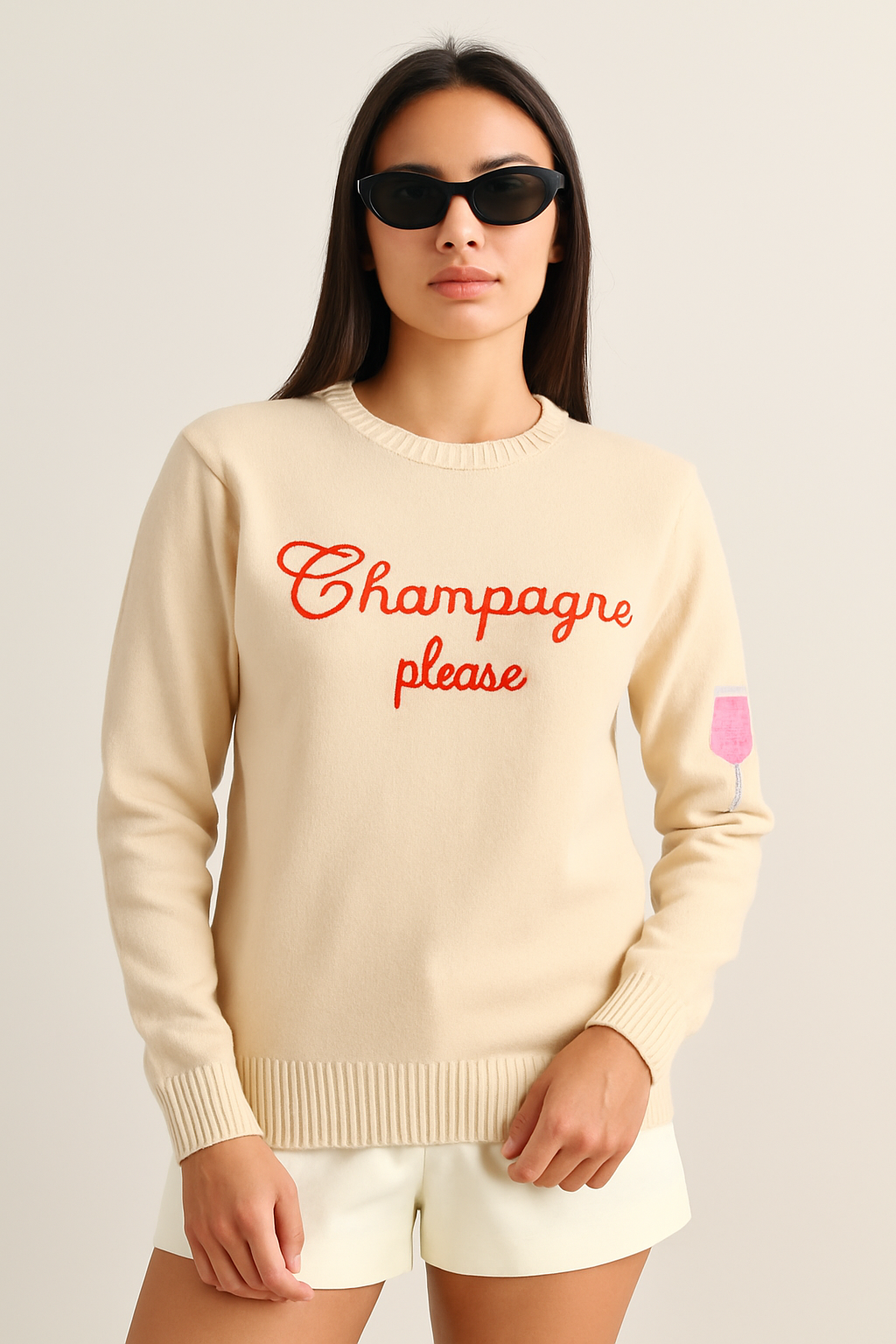 Raise a glass to effortless style with our “Champagne Please” Knit Sweater — a playful, cozy essential for the woman who loves a touch of whimsy in her wardrobe. Crafted from soft, breathable knit fabric, this sweater features a charming embroidered script that reads “Champagne please” in bold red across the front, and a subtle pink champagne glass detail on the sleeve for an extra dash of personality.