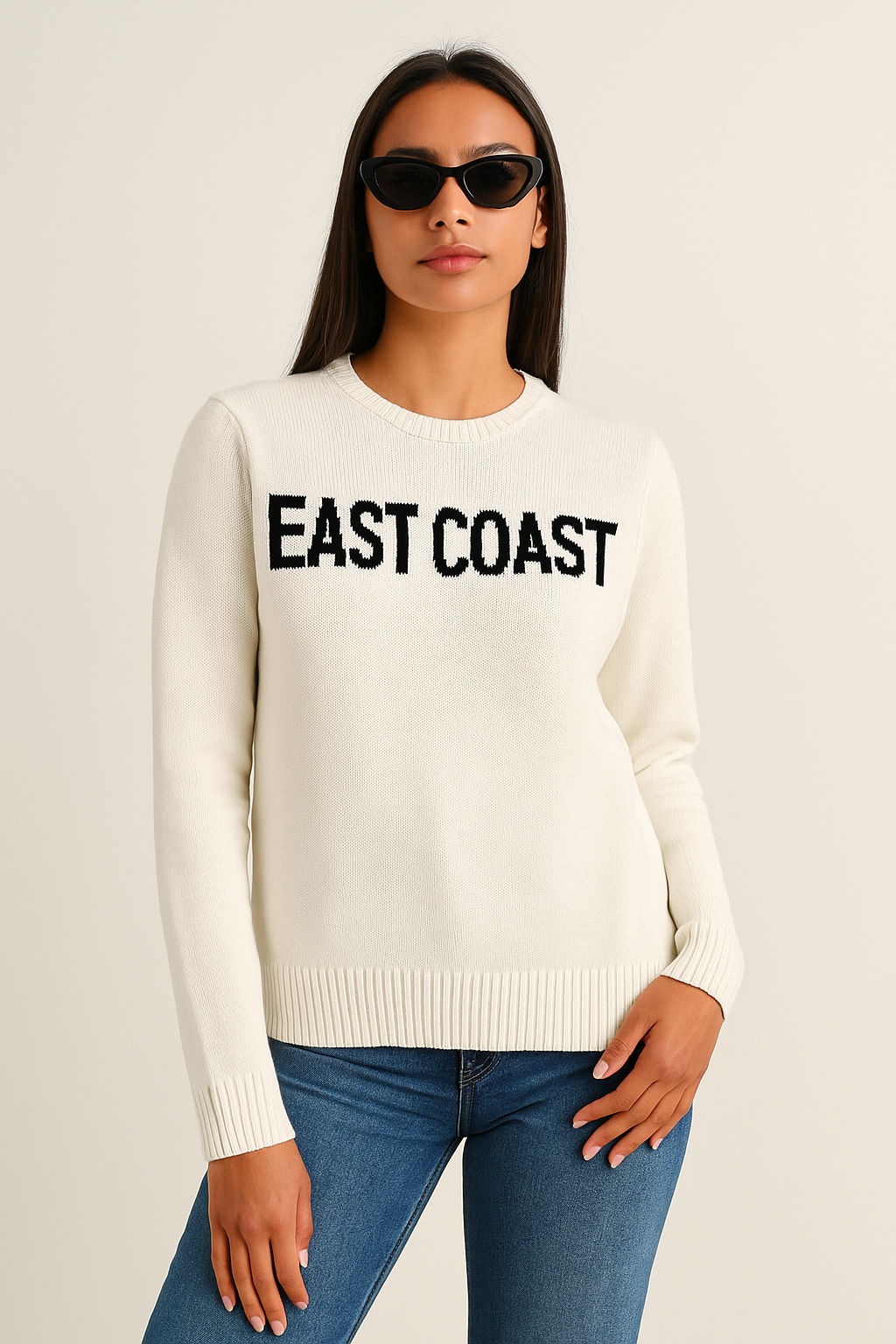 Show your coastal pride in timeless style with our “East Coast” Classic Knit Sweater. Crafted from a soft, medium-weight knit, this cozy white pullover features bold black lettering across the chest — a nod to effortless East Coast chic.