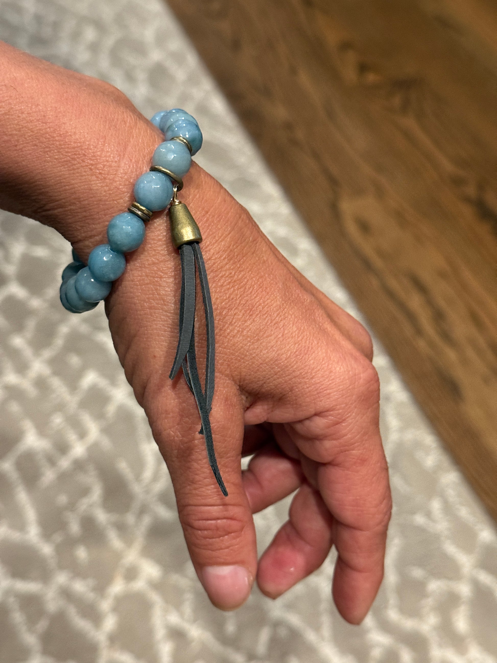 Discover natural elegance with our handmade Amazonite Beaded Stone bracelet. A meaningful, stylish piece for any occasion. Designed with a harmonious mix of soft blue and aqua hues, each bead is naturally unique—symbolizing balance, emotional strength, and calm energy. The bracelet features a subtle antique brass accent and a brown leather tassel, blending bohemian artistry with timeless sophistication.