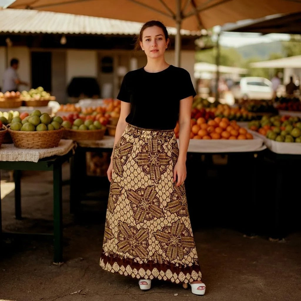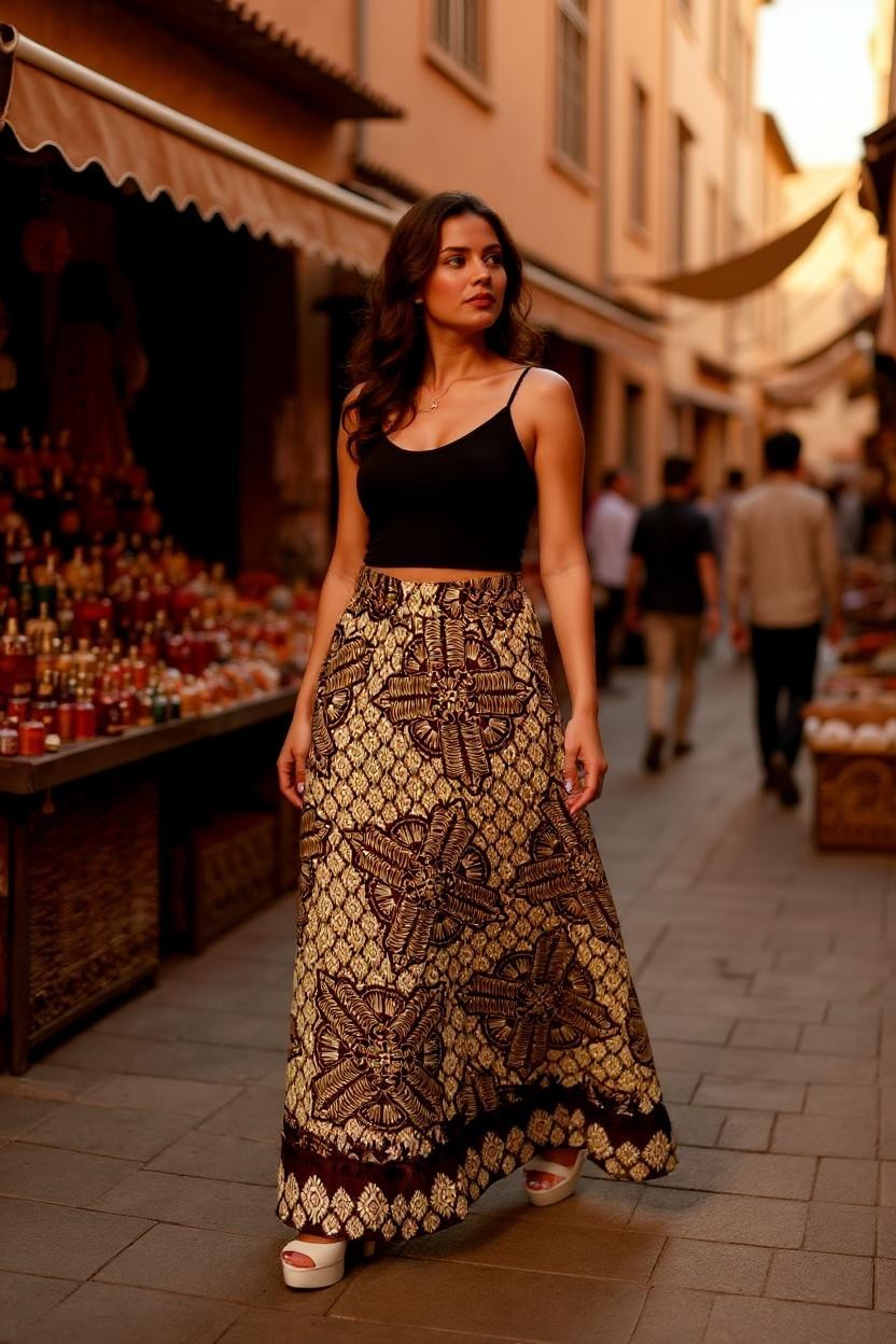 A flowing maxi skirt with an elastic waistband and a striking tribal print in warm brown and beige tones—versatile and easy to wear.