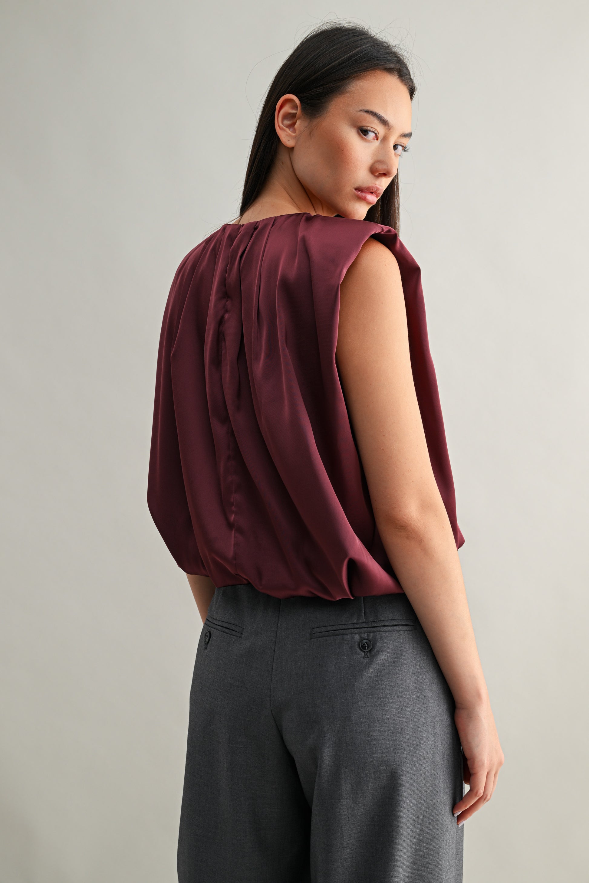 This structured cotton sleeveless blouse features bold shoulders and a bubble hem finish. Designed with a slight scoop neckline. Pairs perfectly with the knit fringe skirt or the della denim trousers & blazer. Color: Wine