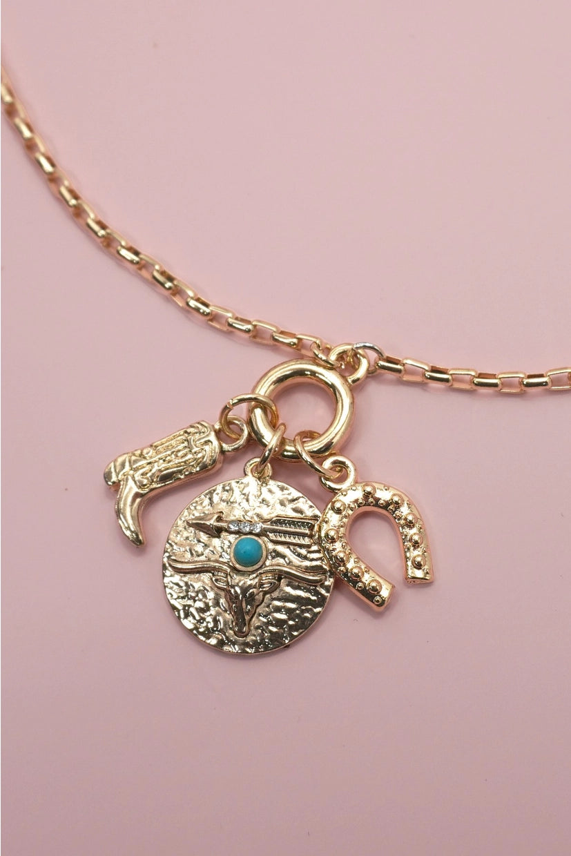 Elevate your accessory game with the Western Cluster Charm Necklace, expertly crafted to blend rustic charm with modern elegance. This necklace features a thoughtfully arranged cluster of distinctive charms that evoke the spirit of the West, making it a versatile piece suitable for both casual and refined ensembles.