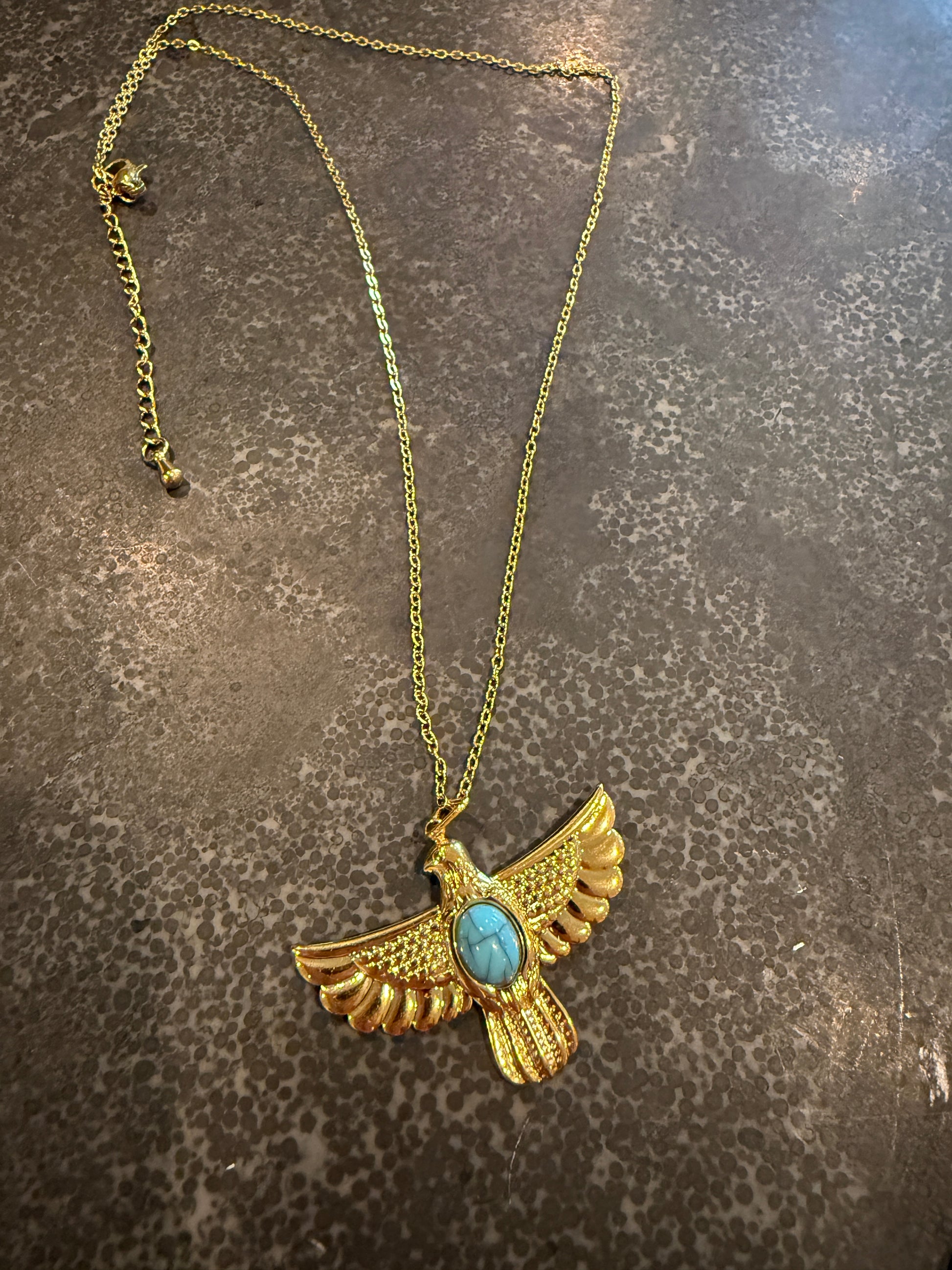 Channel bold energy and timeless symbolism with this stunning Gold Thunderbird Necklace. Crafted with a radiant gold-tone finish, the pendant features a powerful thunderbird in mid-flight—its wings outstretched in strength and freedom. At its center sits a striking turquoise-style stone, believed to bring protection, wisdom, and healing.